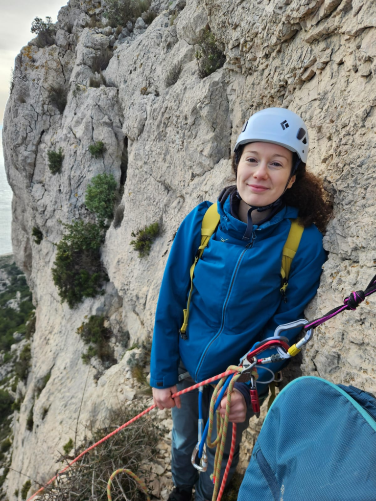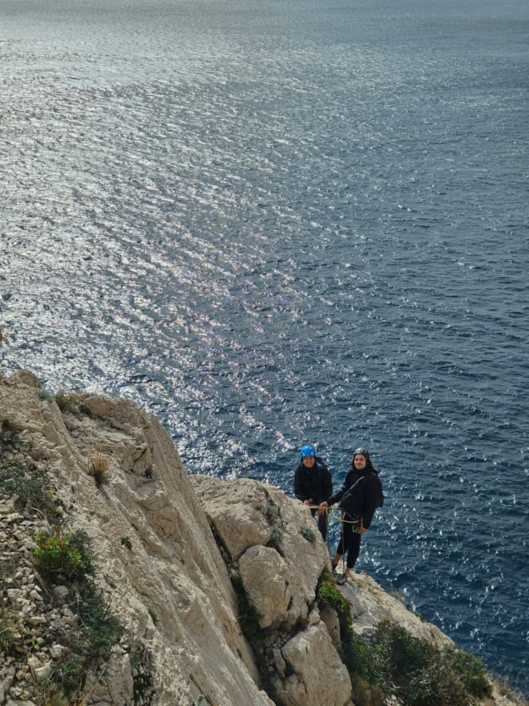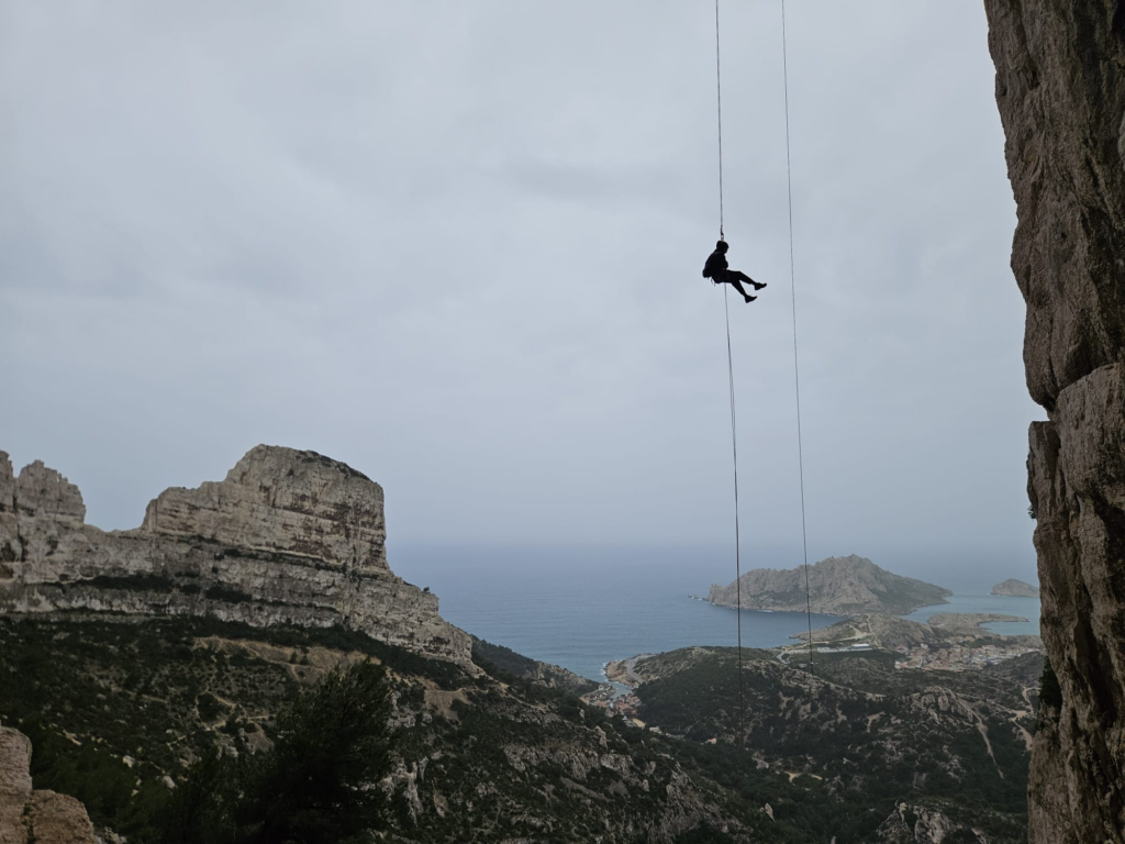 D’en haut, la vue se déploie sur les rochers des Goudes et le petit village de Callelongue en contrebas. La descente par les deux rappels enchaînés de la grotte de l’Ermite (10 minutes de marche depuis le haut de la voie), s’effectue sous un début de crachin, qui se transforme en belle averse une fois toute l’équipe sur la marche du retour.