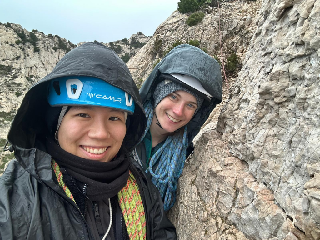 Malgré le lever tôt, un groupe déjà dans la voie nous permet de repérer le début facilement et d’identifier le relai intermédiaire en L1 qui épargne pas mal de tirage. Cyril mène la flèche, suivi d’Ilaria et Charles, Béatrice et Hélène forment une deuxième cordée en réversible. Nous enchaînons les quatre longueurs assez vite, pressés par la pluie qui menace. La plus belle longueur est la troisième, une 5c qui commence par un pas de traversée au-dessus du vide, puis s’achève par une magnifique dalle en gouttes d’eau.